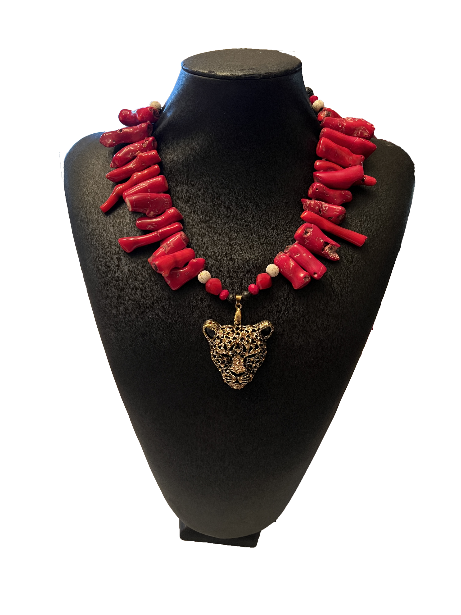 Elevate your style with our Crystal Jaguar Pendant, adorned with striking Red Branch Coral, Black Lava Rock, and dazzling Red Crystal Accents. Embrace the boldness of the jaguar and add a touch of luxury to any outfit. A true masterpiece for the fashion-forward.