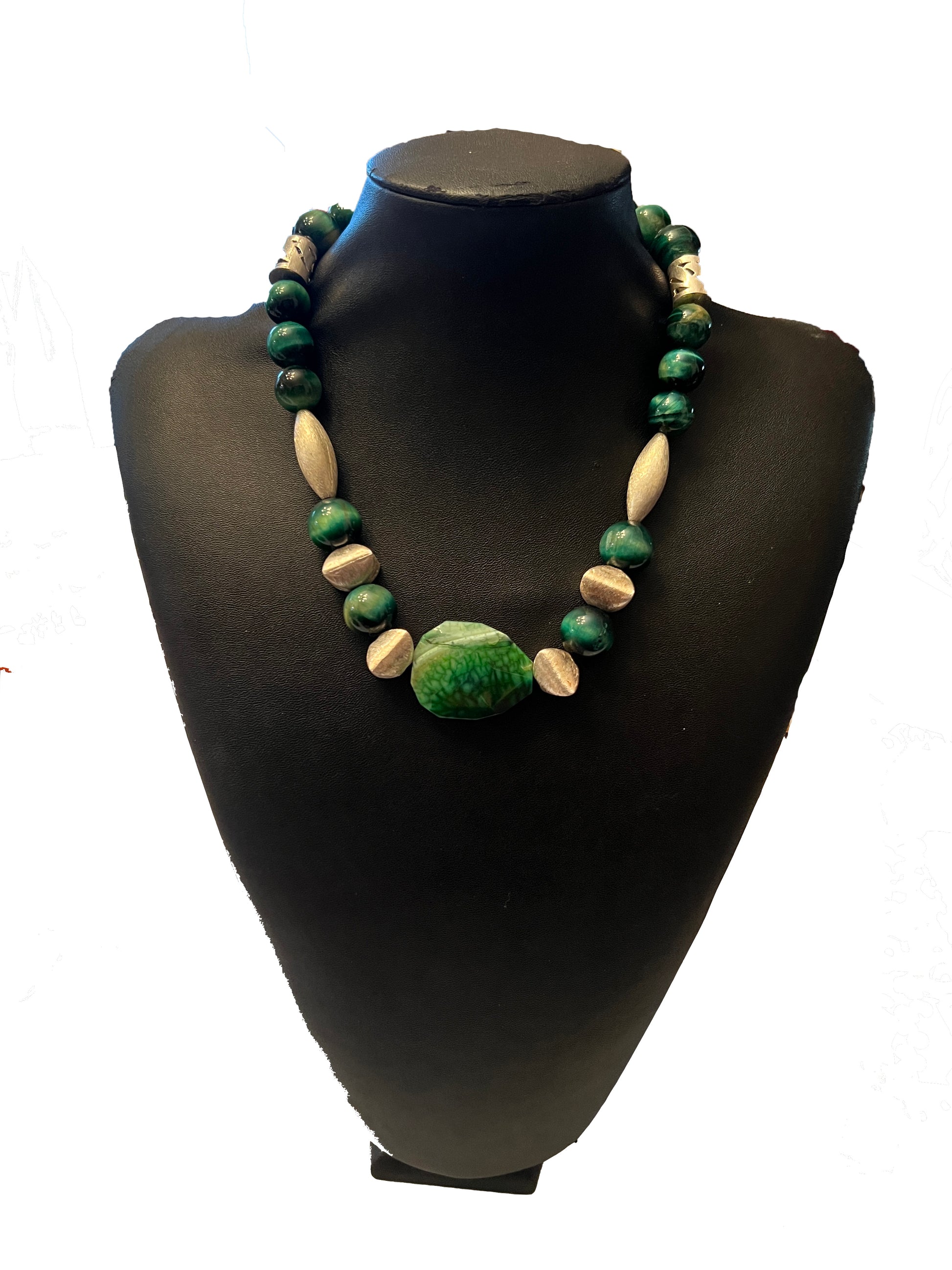 Green Faceted Agate combines the natural beauty of green tiger's eye with the elegance of silver brushed metal and cutout barrels. The result is a luxurious and exclusive piece that exudes sophistication and style. Elevate your look with this stunning accessory that is truly a work of art.