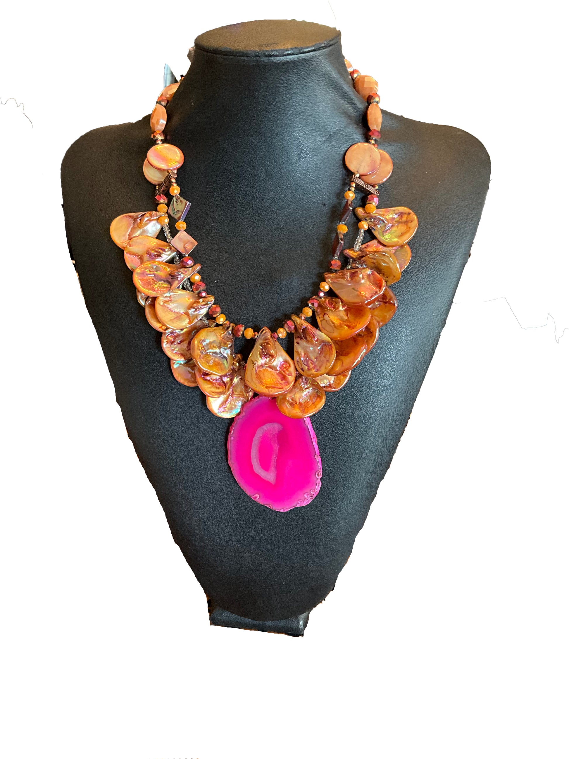 Indulge in luxury with our Mother of Pearl Teardrops necklace. Adorn yourself with this elegant piece featuring Czech Crystals and Fuchsia Agate drops, adding a touch of sophistication to any outfit. The beautiful fuchsia and orange hues make it perfect for any occasion - a must-have for your collection.